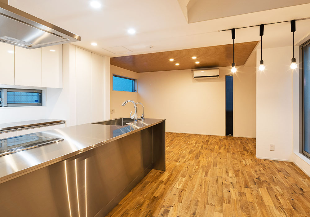 オーダーキッチン、手洗い、鉄骨ストリップ階段、しっくい塗り壁ほか